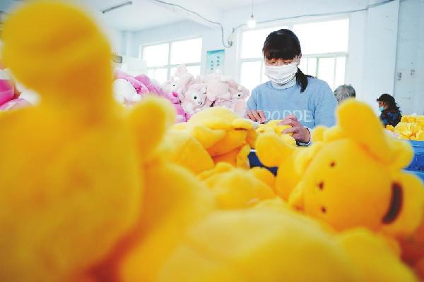 近日,内丘县一家玩具企业的工人在车间加工毛绒玩具。