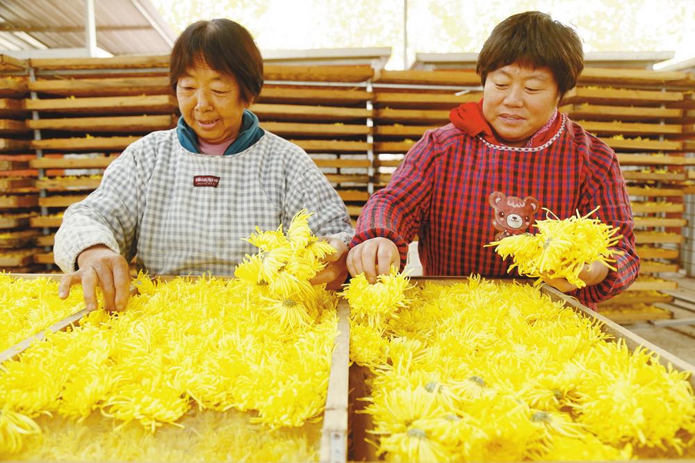 近日,新河县后沙洼村的村民在分拣菊花。
