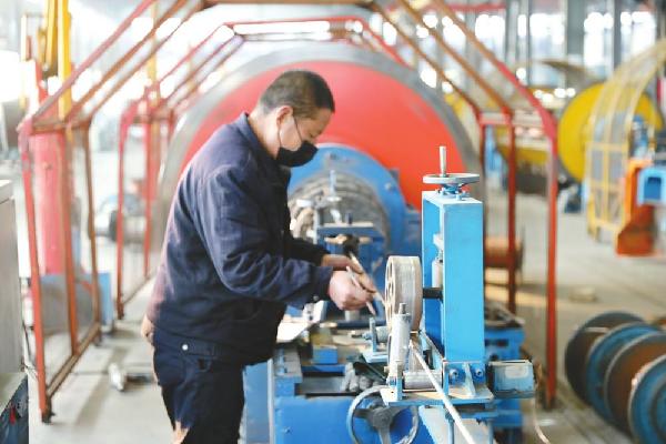 明达线缆集团生产车间,工人正在检测线缆生产情况。李 策摄