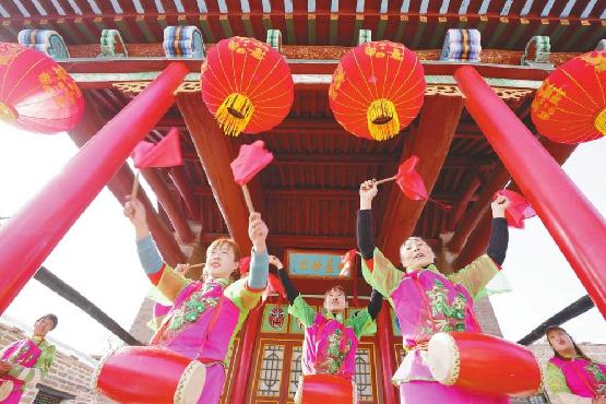 1月17日,内阳村村民排练“开门红腰鼓”节目。新春佳节临近,在太行山深处的信都区将军墓镇内阳村,村民们紧锣密鼓排练锣鼓、腰鼓、跑驴、扭秧歌、划旱船等传统乡艺节目,为即将举办的“村晚”做准备。内阳村历史悠久,村中有古戏楼、古院落等历史建筑,被列入第五批中国传统村落名录。新华社发(田晓丽摄)