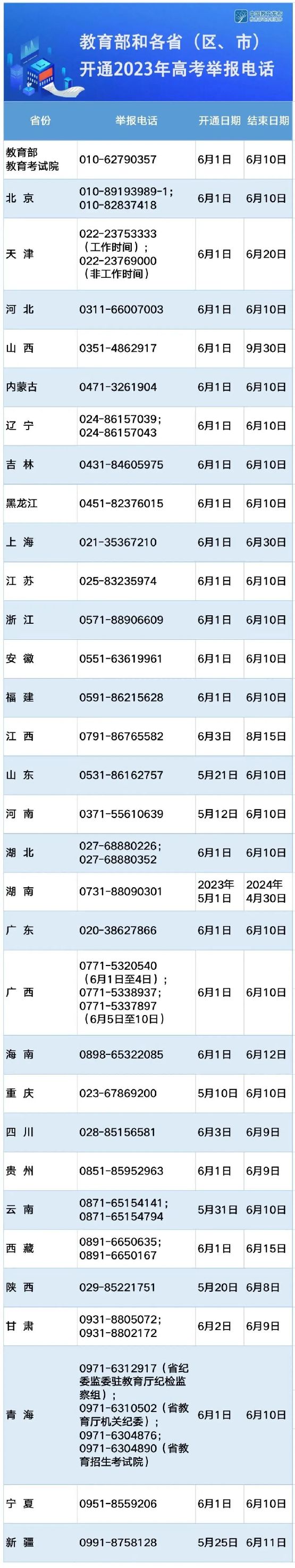教育部公布2023年高考举报电话