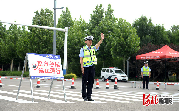 6月7日,在河北南宫中学考点外,公安交警在路口执勤。河北日报记者 赵永辉 摄