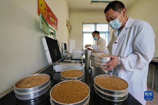 6月18日,在位于柏乡县的河北柏粮粮食储备集团有限公司,工作人员在检测小麦质量。时下,河北省邢台市柏乡县的夏粮收购工作全面展开,粮食企业忙着进行称重过磅、抽样检测、卸车入库等工作,确保小麦颗粒归仓。新华社记者 牟宇 摄
