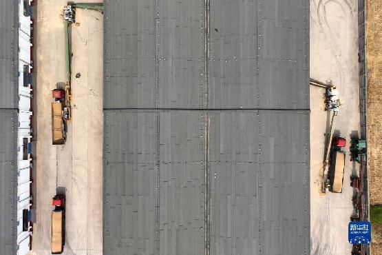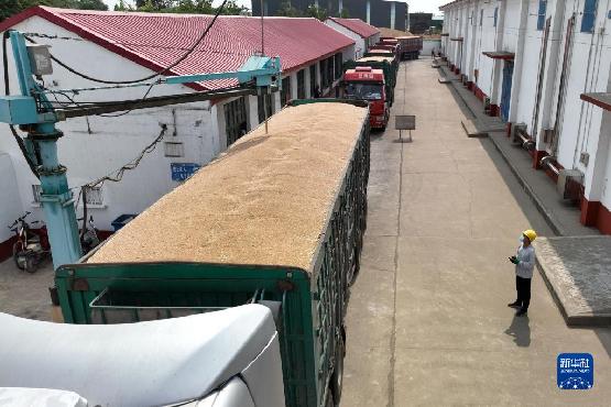 6月18日,在位于柏乡县的河北金谷源粮油集团股份有限公司,作业车辆正在将收购的小麦入库(无人机照片)。时下,河北省邢台市柏乡县的夏粮收购工作全面展开,粮食企业忙着进行称重过磅、抽样检测、卸车入库等工作,确保小麦颗粒归仓。新华社记者 牟宇 摄