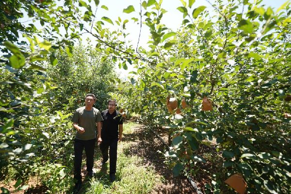 ↑6月30日,贾志华(右)与队员梁国军查看苹果长势。