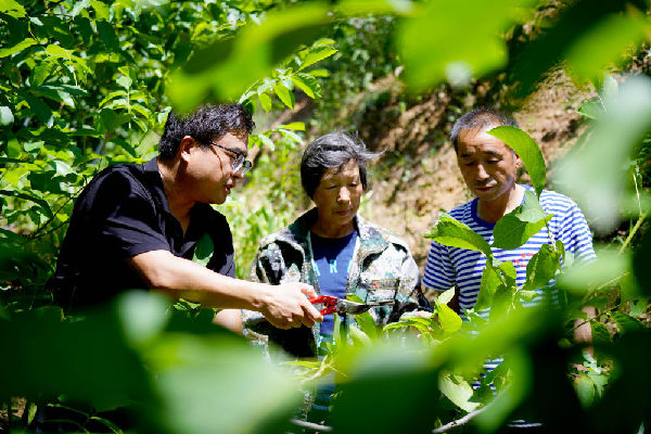 ↑6月30日,贾志华(前右二)在河北省临城县贾庄村为农民讲解核桃树夏季管理知识。