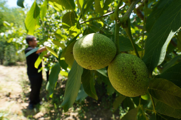 ↑6月30日,贾志华在河北省临城县贾庄村管理种植的核桃。