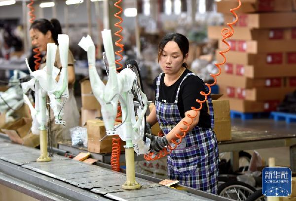 ↑ 9月18日,河北省威县一家童车生产企业工人在生产车间组装童车。