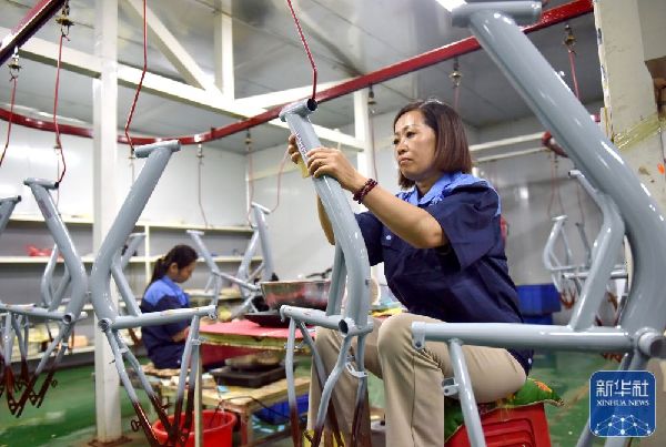↑ 9月18日,河北省威县一家童车生产企业工人在生产车间整理车架。