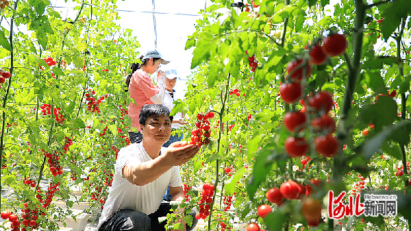 第四届中国·北方农业(蔬菜)科技创新发展大会6月8日在赵县实验基地举办。图为参展者在蔬菜大棚了解番茄长势。河北日报通讯员朱涛摄