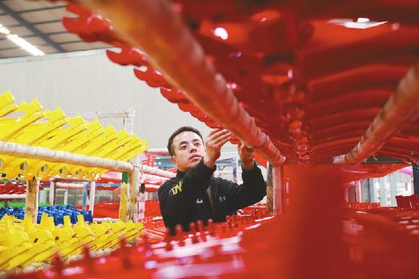 广宗县的河北天王自行车科技有限公司生产车间里,工人检查车架质量。梁智晓摄