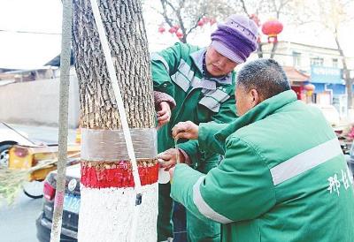 本报讯 日前,在南园街附近,园林工人们在给白蜡树缠树膜。他们首先用稀泥抹平白蜡树干,随后用胶带层层缠绕,包裹平整。“给树木缠‘腰带’,是为了防治草履蚧。”一位园林工人说。