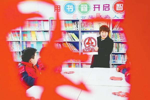 3月4日,市经开区南街小学教师在指导学生创作雷锋刻纸作品,让学生在刻纸过程中了解雷锋故事,进一步学习弘扬雷锋精神。