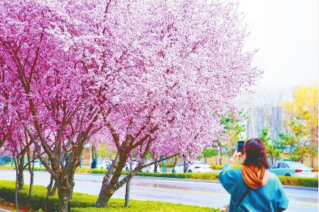 近日,中华大街上美人梅盛开,满街春色惹人注目,行人纷纷驻足打卡,定格春意。 (程一诺摄)