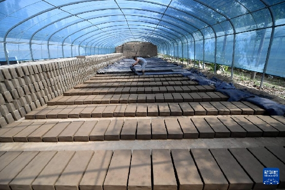 5月15日,陈建磊在摆放准备烧制的青砖。 新华社记者王晓摄