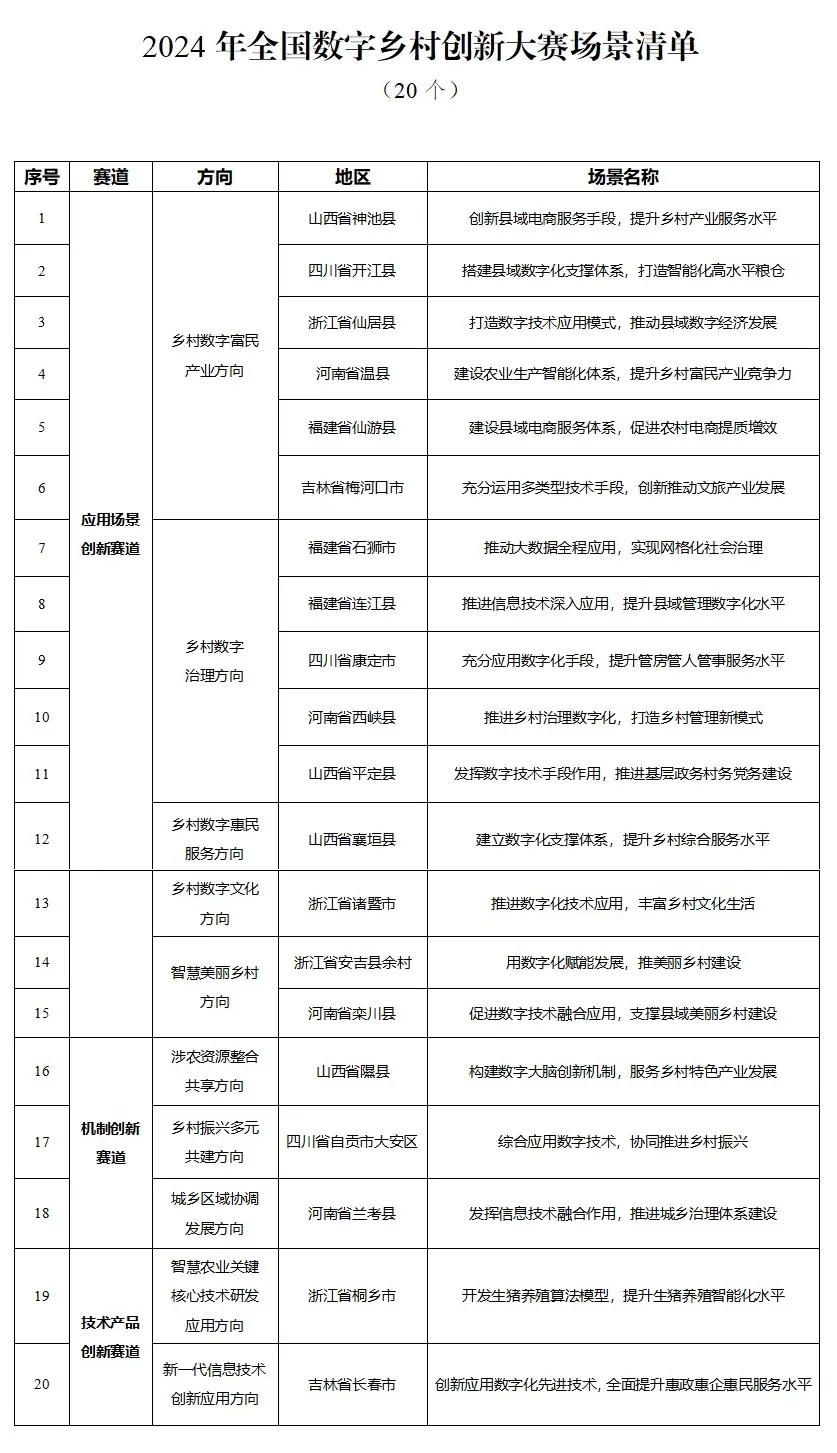 为全面贯彻落实党的二十大和二十届二中全会精神,深入贯彻习近平总书记关于“三农”工作的重要论述,引导社会力量广泛参与数字乡村建设,激发数字乡村创新活力,进一步发现挖掘优秀人才,宣传推介典型案例,推动创新成果应用落地,经中央网信办批准,举办2024年全国数字乡村创新大赛(以下简称大赛)。现将有关事项公告如下:
