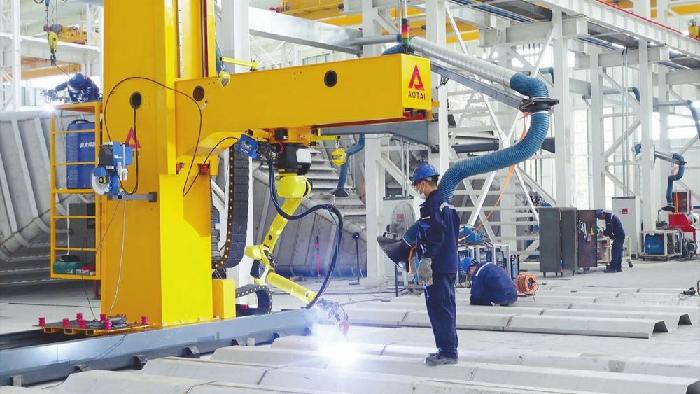 近日,记者走进河北新珑智控科技有限责任公司,看到机械吊臂在空中“飞舞”,将一块块钢板放入切割机内。待切割、铆接完后,型材便通过自动装置进入焊接环节。根据需要,有的型材被运送至固定焊接机处继续作业,有的则被运送至指定位置,一辆辆移动焊接机驶到该处进行焊接。之后,各处焊接完的型材分别被运到形状不一的“房子”前。这些“房子”就是不同类型的数控加工设备。只见工人拉开“房门”,输入指令,自动上料、产品成型、产品下线,整套生产流程十分流畅。