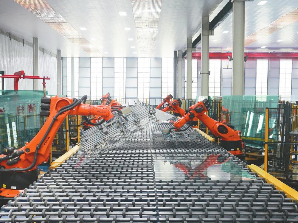 近日,在沙河河北德金玻璃有限公司一窑两线汽车电子玻璃生产线上,机械手精准地将刚生产的玻璃进行等级筛选、码垛。