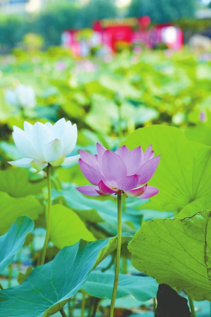 日前,在牛尾河公园的荷塘,荷花已进入盛开期。正所谓“接天莲叶无穷碧,映日荷花别样红。”大片荷叶衬托着姿态各异的荷花,有的含苞待放,有的只展开几片花瓣,有的已全部盛开……荷塘清香飘荡,吸引众多市民纷纷前来打卡。(于海波 白瑞英摄)