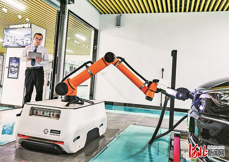 图为6月13日,雄安新区剧村变电站内,移动抓枪式充电机器人利用AI算法自动规划最佳的充电路径,为车辆自动充电。(资料片)河北日报记者耿辉摄