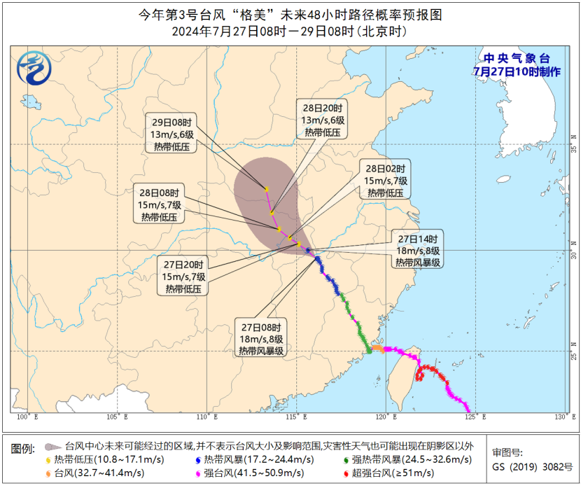27日10时,2024年第3号台风“格美”(热带风暴级)中心位于江西省九江市境内。预计“格美”将以每小时10—15公里的速度向西北方向移动,强度逐渐减弱。