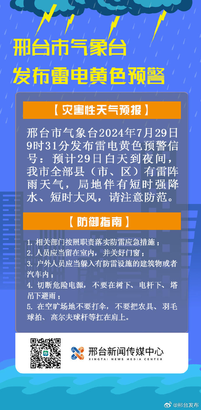 邢台市气象台2024年7月29日9时31分发布雷电黄色预警信号
