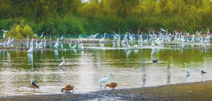 近日,白鹭、夜鹭、池鹭、苍鹭等千余只野生水鸟纷纷翔集京港澳高速跨泜河大桥两侧,或追逐嬉戏、翩翩起舞,或伫立凝望、觅食休憩,或凌空飞翔、鸣叫如歌……给初秋里的泜河增添了一道灵动、迷人的风景。 近年来,我市坚持生态优先、绿色发展,生态环境不断改善,河、湖、湿地等水域吸引了大批鸟儿前来栖息繁衍。 本报记者霍红军通讯员王金戈摄