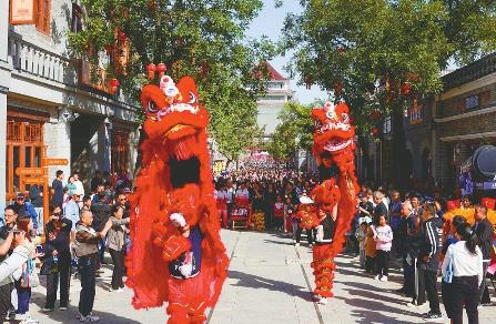 国庆假期以来,邢州古城好南关的舞狮表演吸引大量游客前来拍照游玩。 本报记者 韩文洲摄