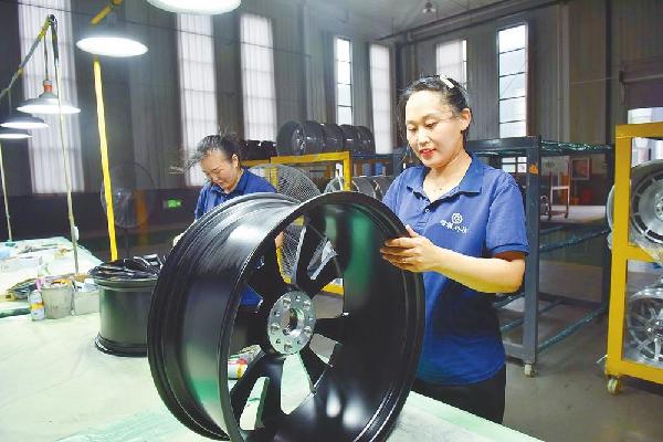 日前,威县一家汽车轮毂生产企业工人在对轮毂进行质检。
