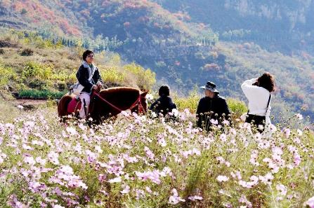 近日,游客在沙河市王硇村的梯田里赏花游玩。