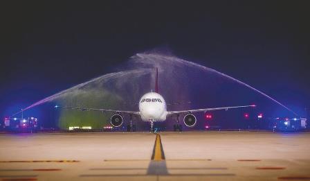 图为从上海浦东机场起飞的航班HO1025平稳降落在邢台褡裢机场,机场举行最高礼仪“过水门”仪式。