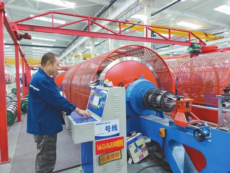位于宁晋县贾家口镇高端智能制造产业园区的泽楷线缆河北有限公司生产车间内,工人正在操作框绞机绞丝。 朱丽娜摄