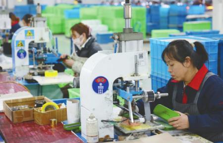图为新河县一家眼镜盒生产企业的工人在赶制外贸订单。