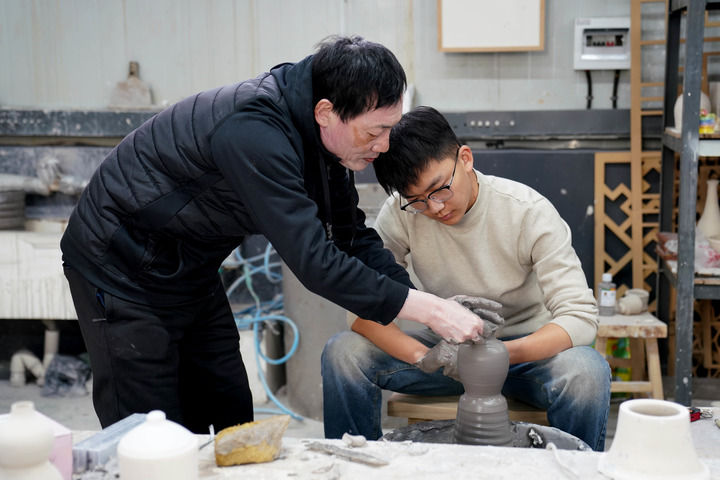 在邢台学院,国家级非遗项目邢窑陶瓷烧制技艺代表性传承人张志忠(左一)指导学生进行陶瓷拉坯。田晓丽 摄