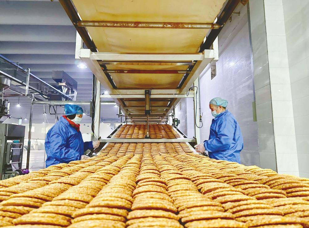 位于宁晋县的河北麦客食品有限公司,工人正在饼干生产线上作业。胡盼玲摄