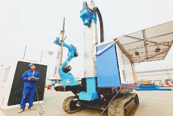 近日,在任泽区河北永明地质工程机械有限公司,工作人员正调试智能钻进一体化钻机。
