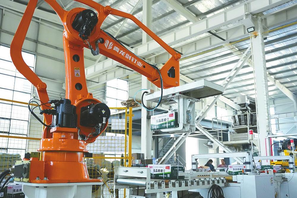 4月14日,河北隆尧青龙剑钉业有限公司车间内,智能码垛机正在将包装好的钉子排列、码垛。