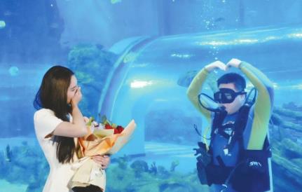 近日,海洋乐园还增设了“海底表白”项目。男生穿着潜水服在水下游弋,透过观景窗与外面的女友隔空比心,并拿出写有“亲爱的请嫁给我吧”的条幅示爱,女友惊喜落泪的画面被镜头永久定格。