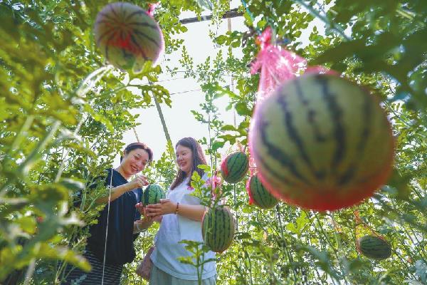近日,游客在内丘县一农庄内采摘西瓜。入夏以来,内丘县多个瓜果种植园硕果累累,吸引众多游客采摘游玩。