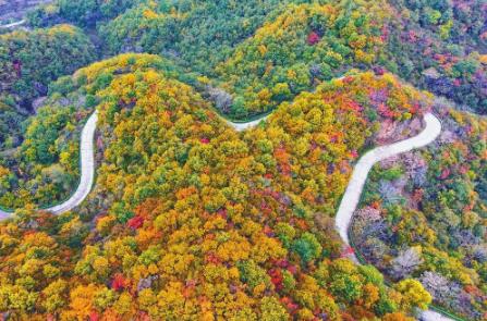 10月19日,无人机拍摄的临城县西部太行山区的蝎子沟国家森林公园。深秋时节,蝎子沟国家森林公园红黄绿叶交织如画,层林尽染、五彩斑斓,形成美丽壮观的醉人景观。