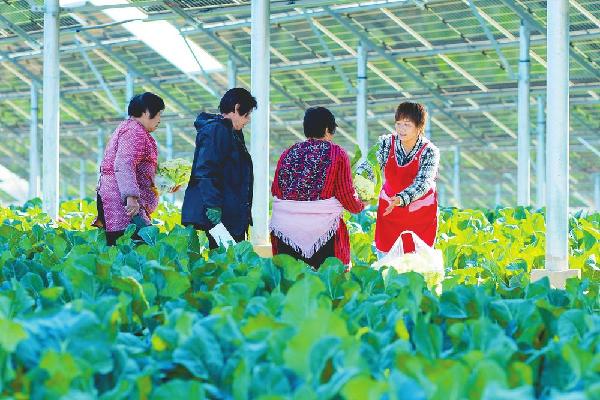 近日,在内丘县五郭店乡光伏发电场农田,农民利用晴好天气采收菜花。