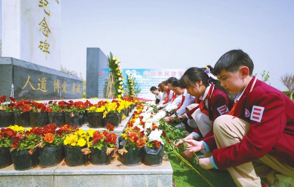 ▲日前,金华实验小学组织教师和少先队员代表到九龙公墓开展祭扫活动。师生们肃立默哀、敬献鲜花,接受红色教育,厚植爱国情怀。 霍红军、高晓博摄